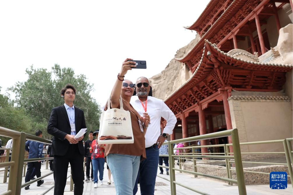 2024年6月7日,前来甘肃调研考察的驻华外交官在敦煌莫高窟九层楼前留影。新华社记者 陈斌 摄