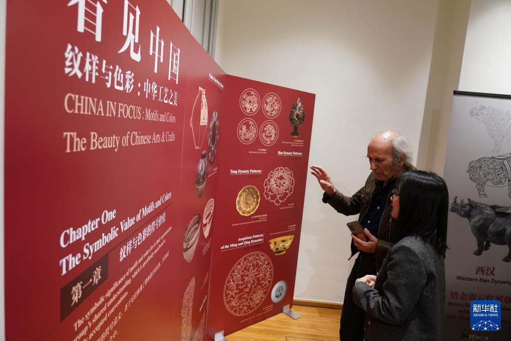 9月27日,在比利时布鲁塞尔中国文化中心,观众在“看见中国”之《纹样与色彩:中华工艺之美》数字文化展上参观。
