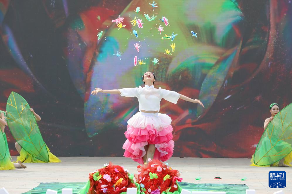 10月10日,艺人在宝丰县新世纪广场表演魔术《奇花幻舞》。