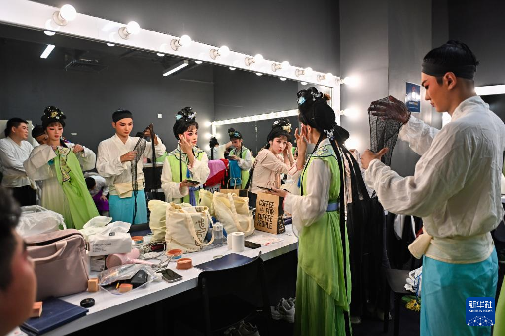 10月18日,在马来西亚吉隆坡,锡剧《追香记》的演员在后台做表演前的准备。