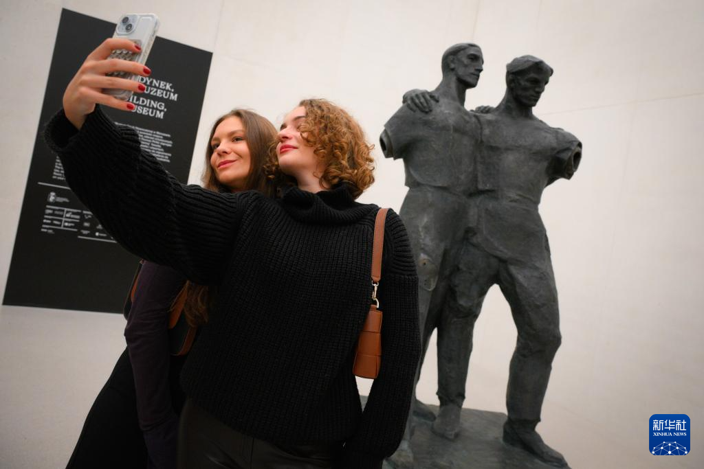 10月25日,两名游客在波兰华沙现代艺术博物馆新馆中的一处雕塑前留影。