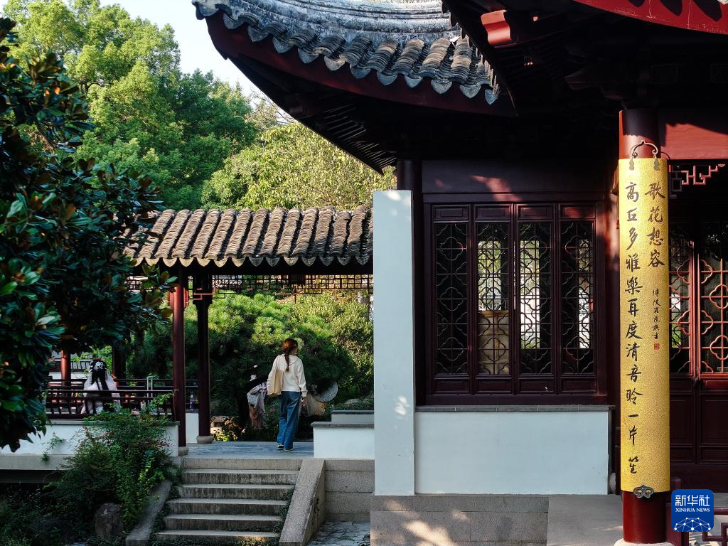 游人在苏州园林西溪环翠游览(10月23日摄,无人机照片)。