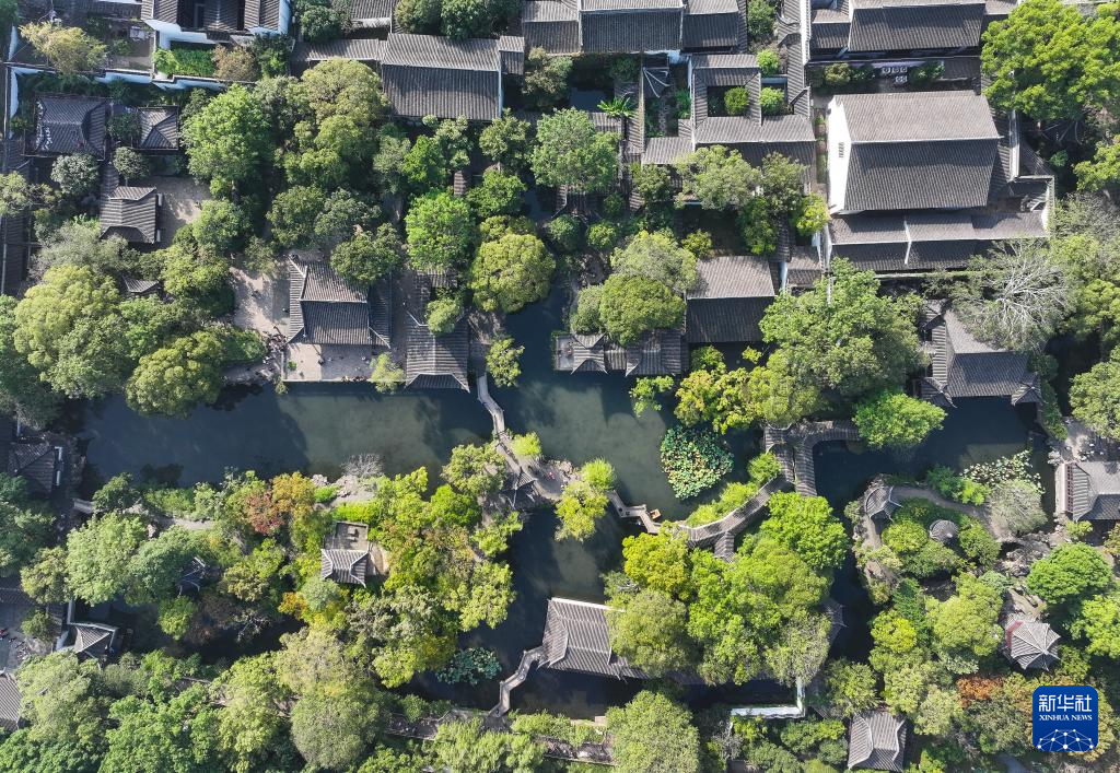 苏州园林西溪环翠游览景色(10月23日摄,无人机照片)。西溪环翠位于虎丘西南麓。