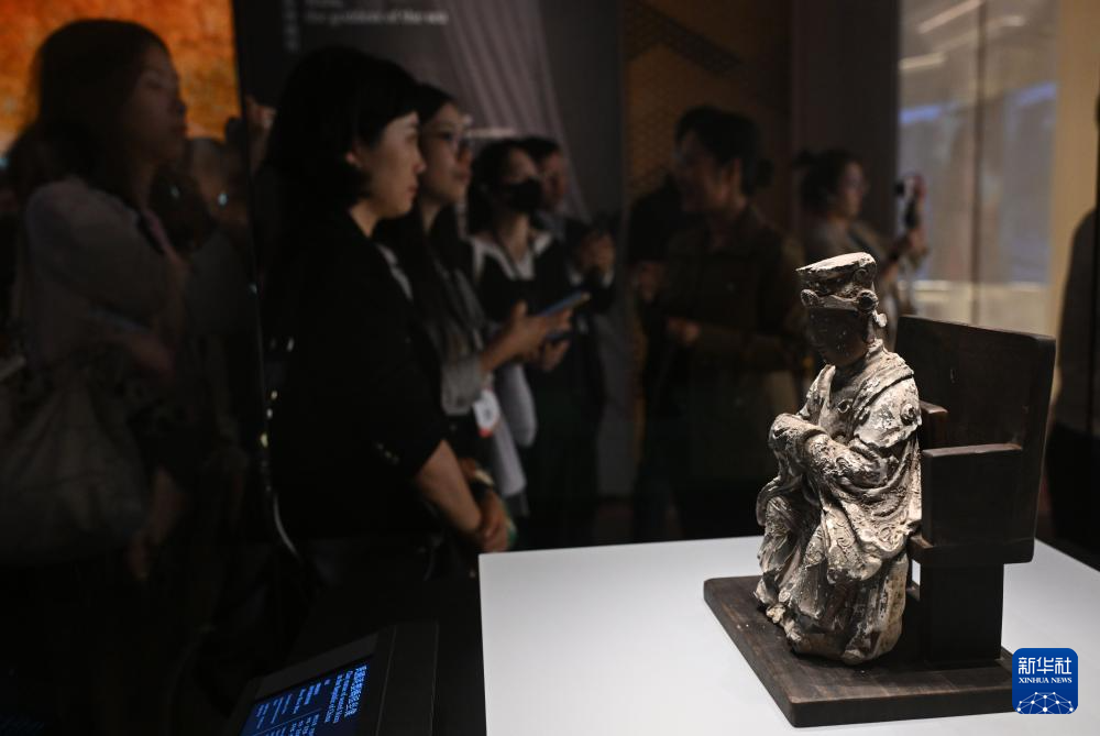 11月16日,观众在保利美高梅博物馆参观展出的泥塑妈祖座像。