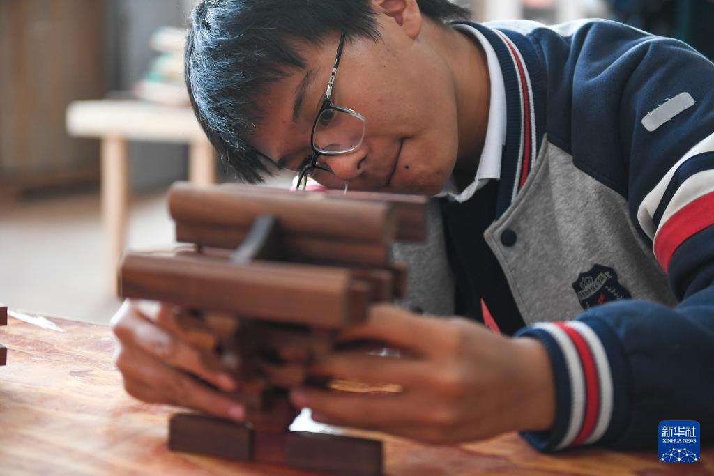 11月22日,在临海市海商职业技术学校,学生在资深工匠的指导下学习制作鲁班锁。
