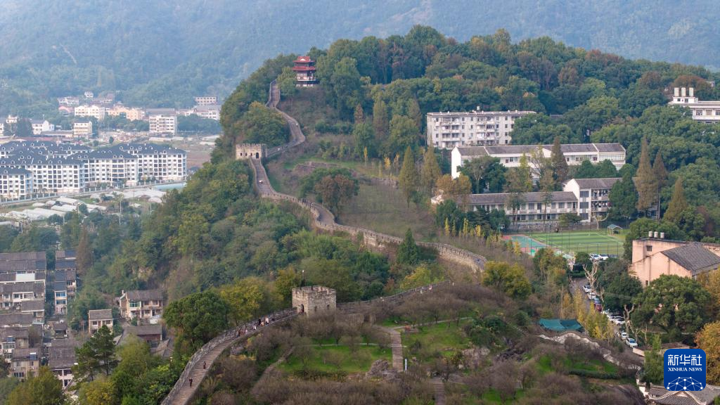 11月22日在浙江临海拍摄的黄大树参与修复的台州府城墙(无人机全景照片)。