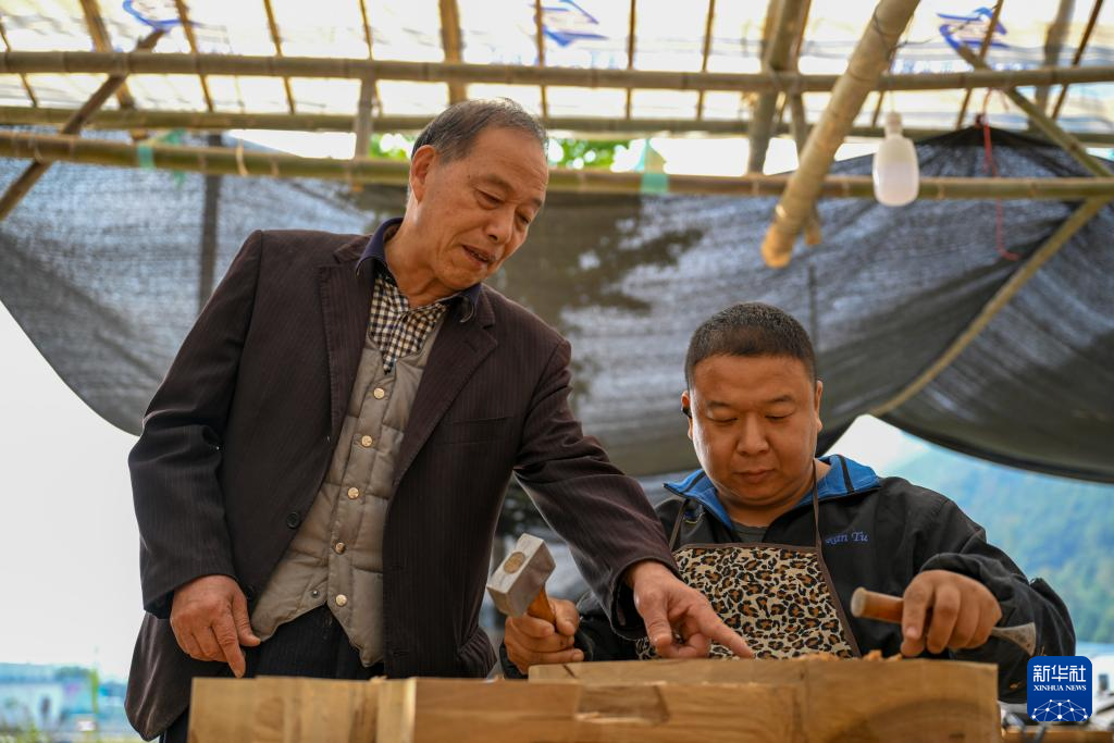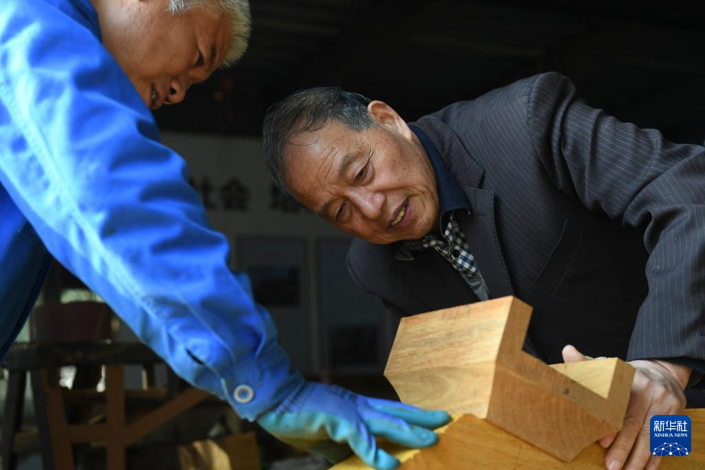 11月22日,黄大树(右)在浙江临海汇溪镇“古建共富工坊”指导当地工匠。