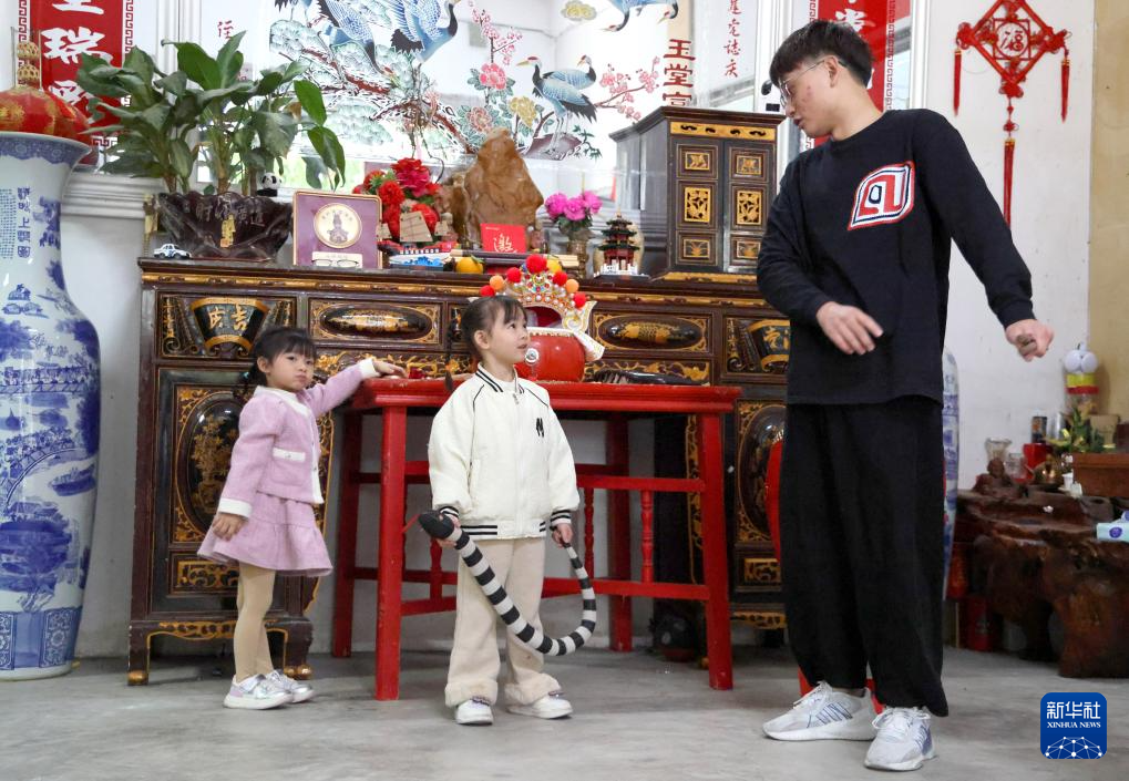 12月9日,爸爸在家里指导庄恩琪(中)练习英歌。