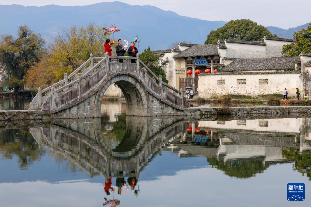 12月9日,在安徽省黄山市黟县宏村,何继星(中)和学员在查看花灯。