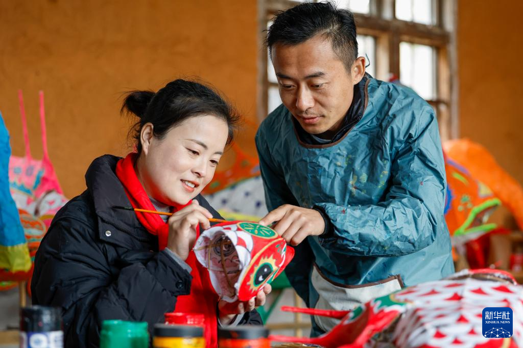 12月9日,在安徽省黄山市黟县宏村,何继星(左)在指导学员制作花灯。