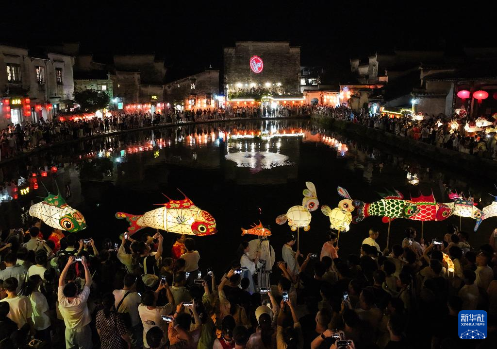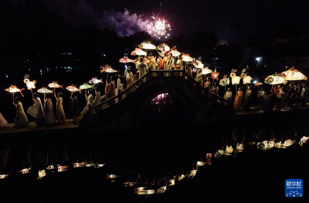 9月15日,花灯表演队伍在安徽省黄山市黟县宏村巡游(无人机照片)。