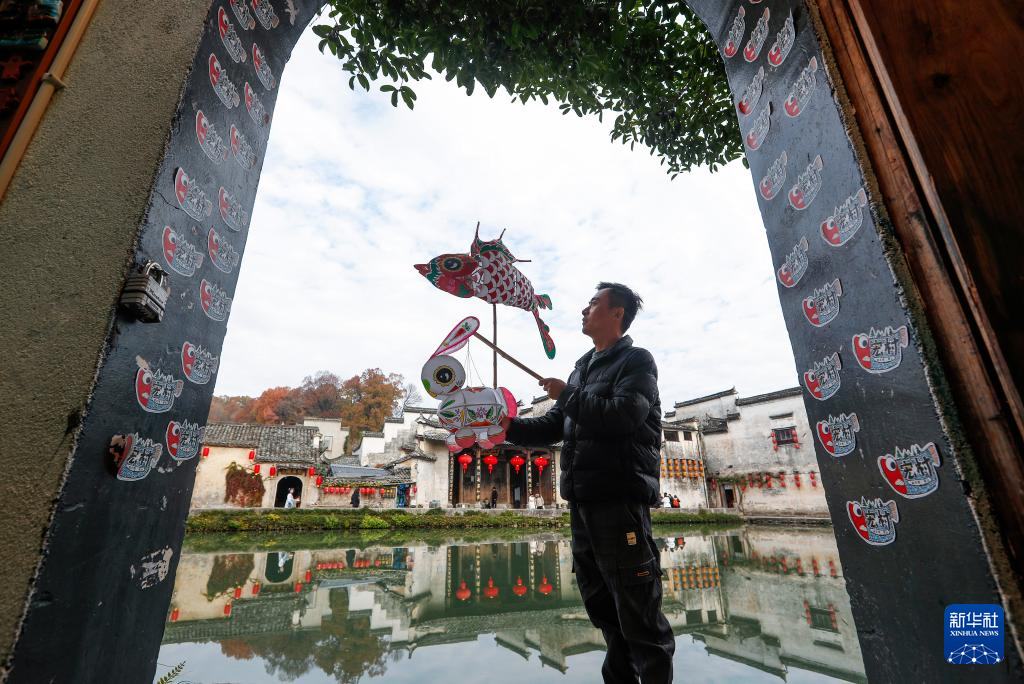 12月9日,在安徽省黄山市黟县宏村,何继星在查看花灯。