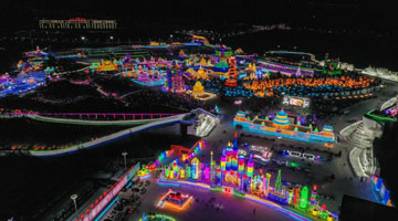 12月17日,游客和市民在哈尔滨松花江畔的大雪人前游览(无人机照片)。