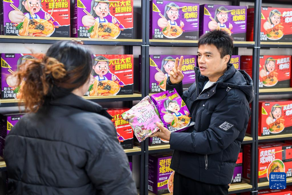 12月13日,在柳州市一家螺蛳粉销售门店,工作人员向顾客推荐袋装螺蛳粉。