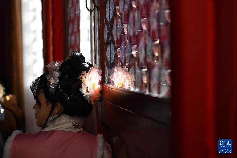 12月21日冬至日,阳光穿过庆成宫正殿的窗花,照亮一名女士的头花。