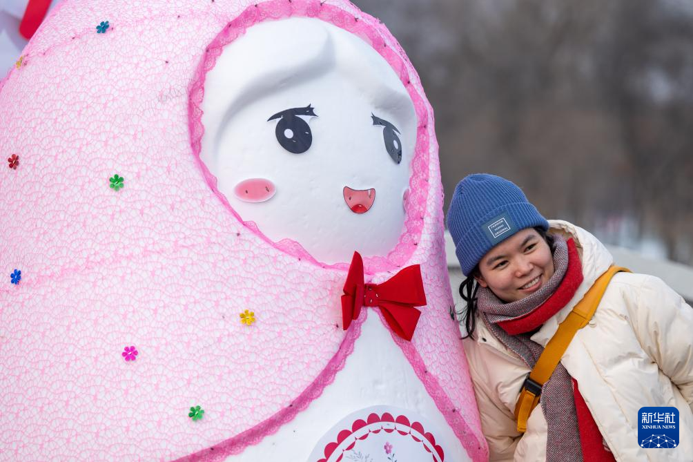 12月23日,一名游客在第37届太阳岛国际雪雕艺术博览会上留影。