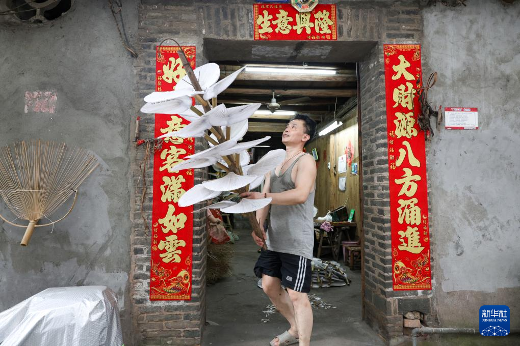 在宁德福安市官埔村,官埔油扇制作艺人林少殊在晾晒油扇(2024年6月25日摄)。