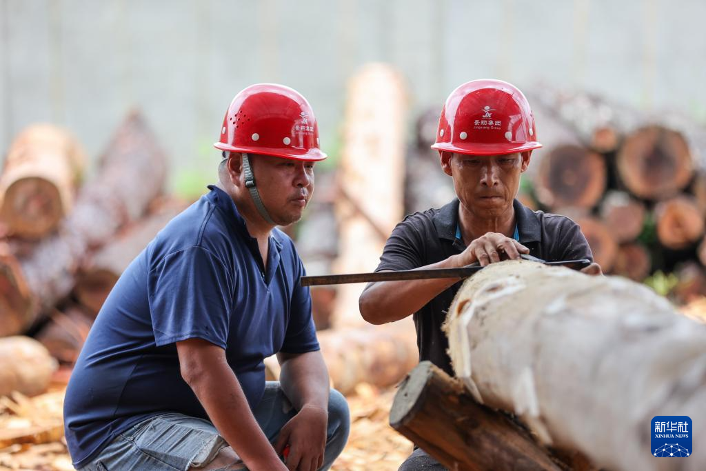 在宁德市屏南县长桥镇,“木拱桥传统营造技艺”市级代表性传承人黄闽辉(左)和团队工匠对修复万安桥所用木料进行测量加工(2023年7月20日摄)。万安桥保护修复工程由当地廊桥建造世家、木拱桥传统营造技艺传承人黄春财、黄闽辉父子主持。