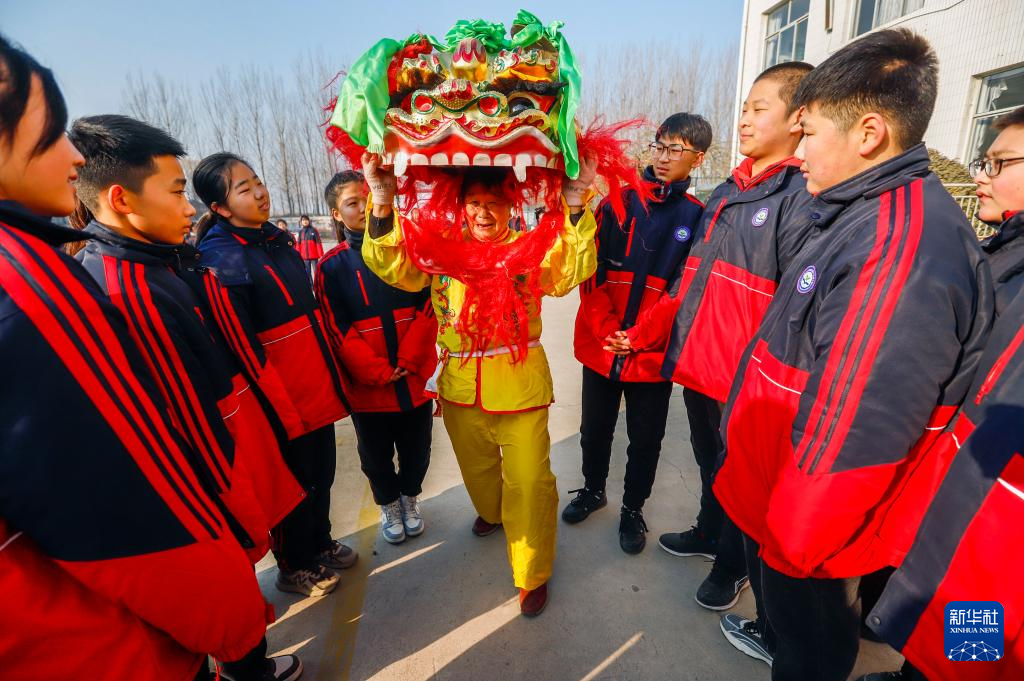 12月25日,民间艺人在河北省遵化市苏家洼镇下石河中学为学生讲解舞狮技巧。