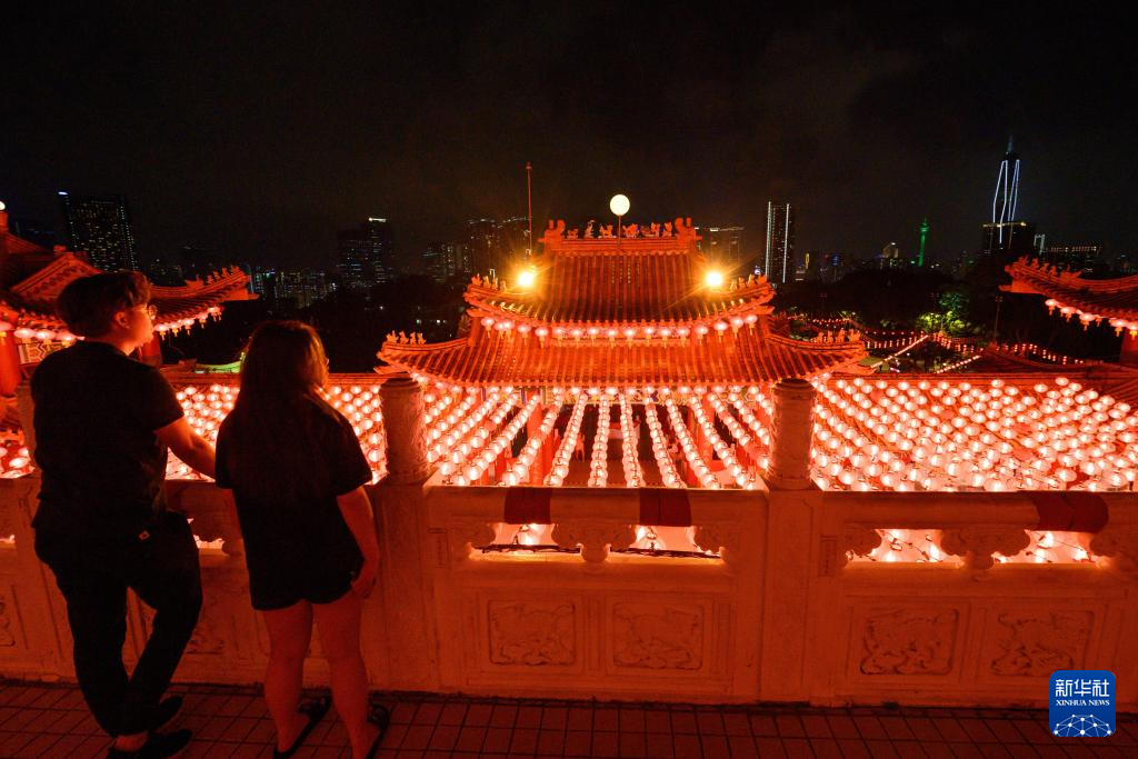 1月21日,在马来西亚吉隆坡天后宫,市民欣赏节日彩灯。