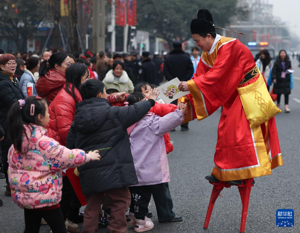 1月22日,在绵竹年画节开幕式上,踩着高跷的演员与群众互动。