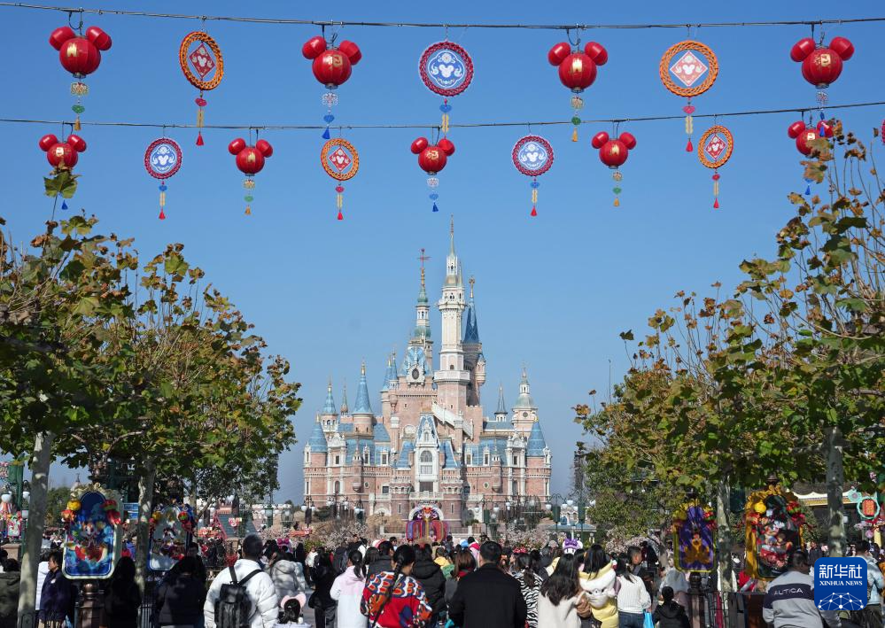 在上海迪士尼乐园,米奇头形状的花灯高挂(1月22日摄)。