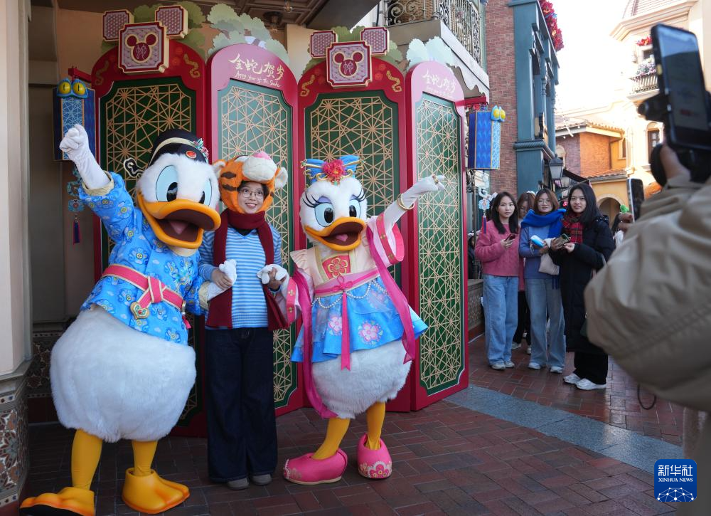 1月22日,在上海迪士尼乐园,游客与穿着中式新装的唐老鸭和黛丝合影。