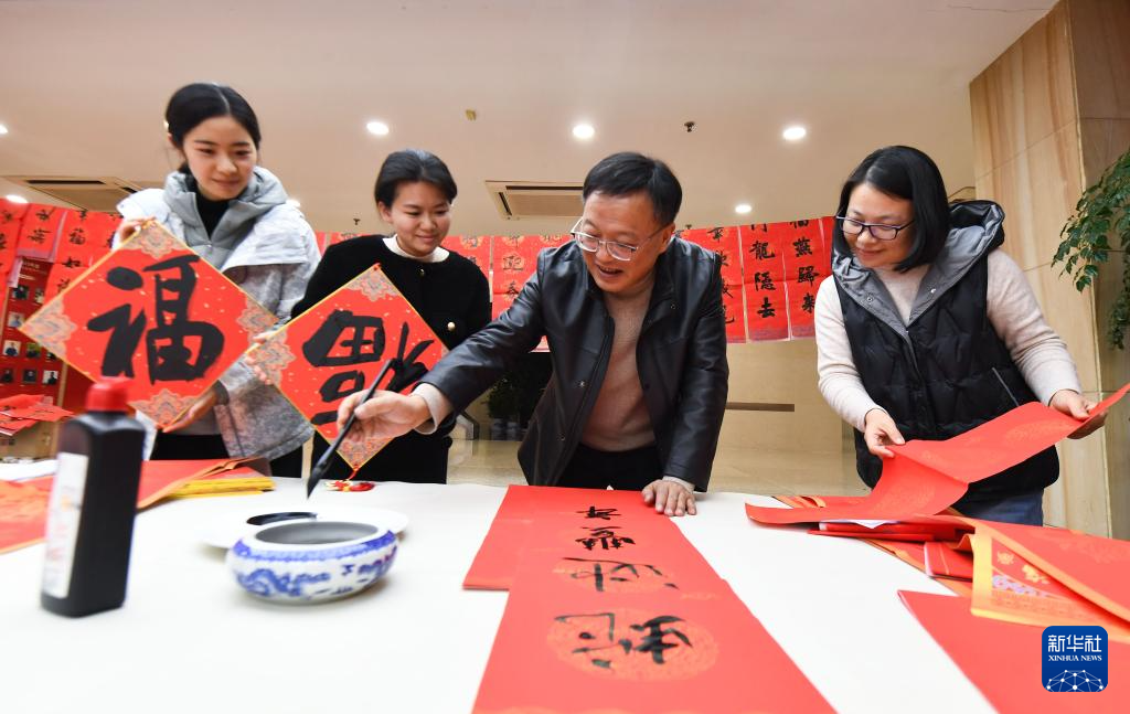 1月23日,南京艺术学院的书法老师为江苏省教育考试院的干部职工写春联、送祝福。