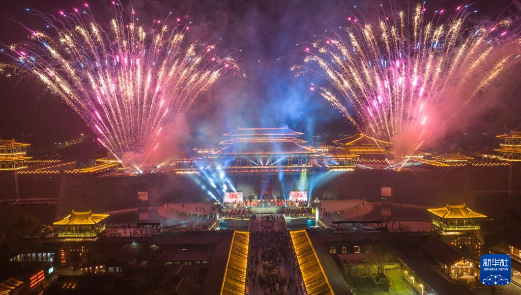 1月22日,游客在湖北省襄阳市唐城景区观看烟花灯光秀(无人机照片)。