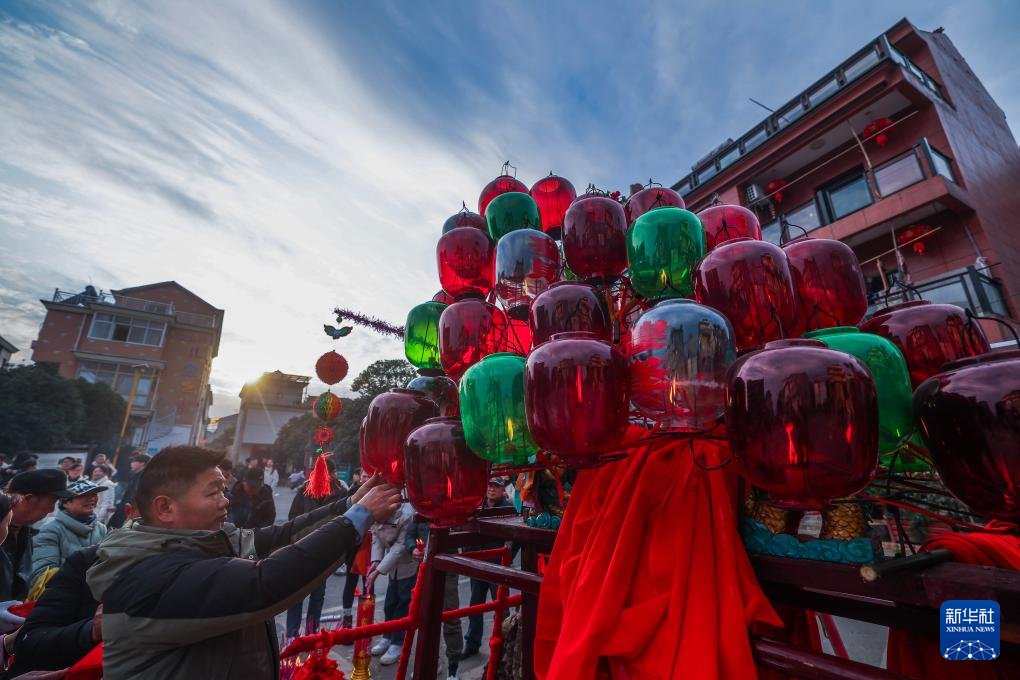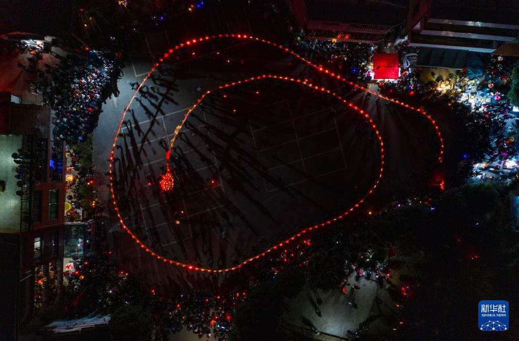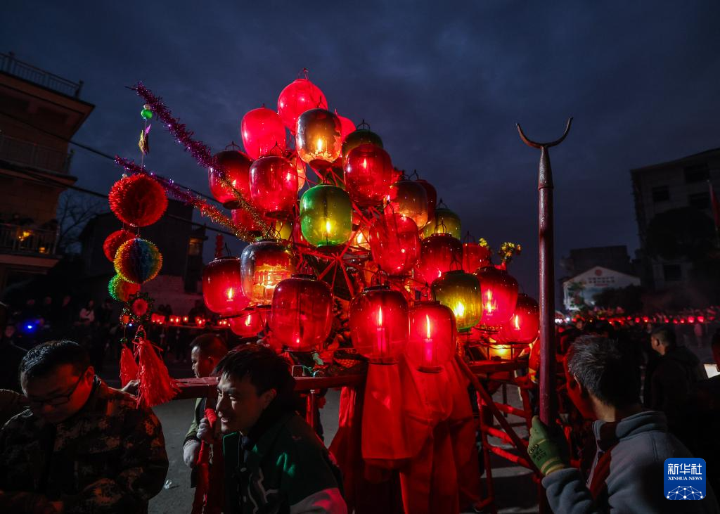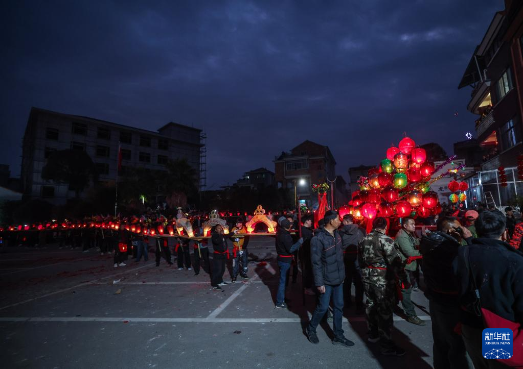 当日是农历正月十三,浙江省金华市金东区赤松镇虎岩村村民肩扛由100余节板凳组成的传统五彩龙灯,沿村道蜿蜒游舞。板凳龙的龙头被彩灯包裹,装饰有花卉、祥云等图案,在烛光摇曳间营造出“龙腾盛世”的年俗画卷。每年元宵节前后,浙江省金华市金东区赤松镇的各村村民都会舞起板凳龙灯,祈求来年风调雨顺、五谷丰登。