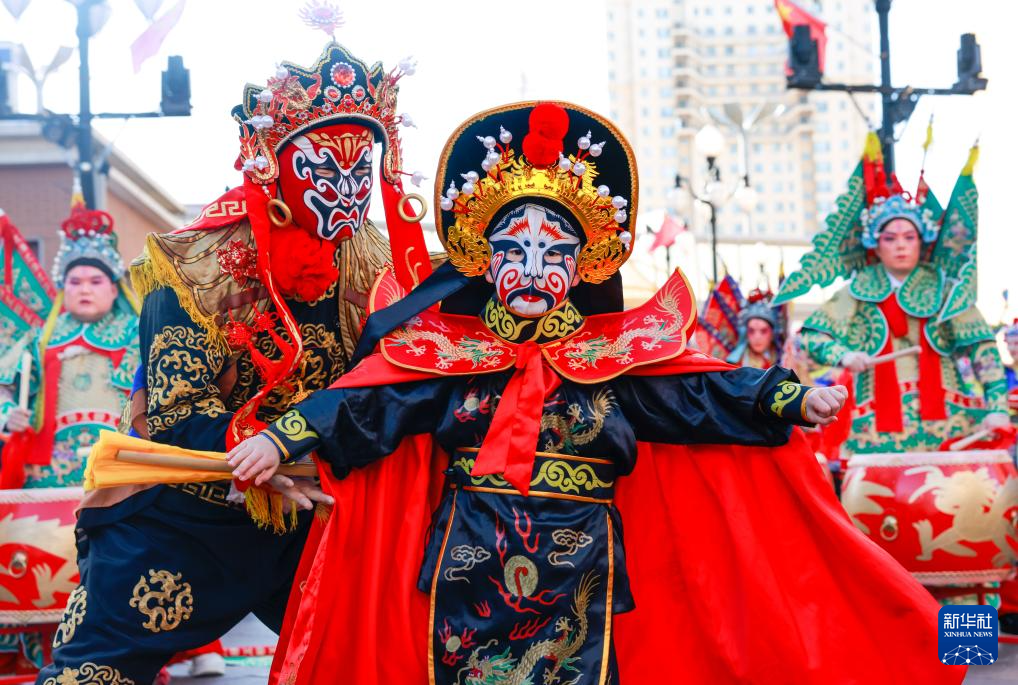 2月11日,民间艺人在河北省遵化市华明路街道表演民俗节目。