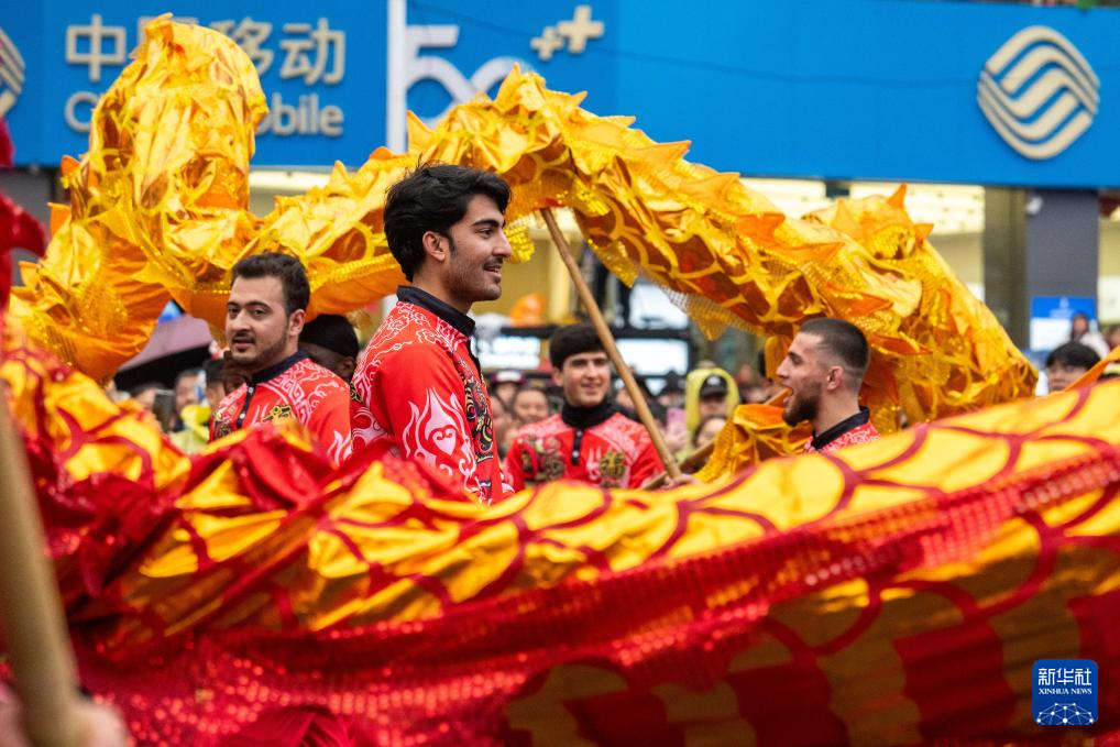 2月12日,外国留学生在张家界市永定区参与舞龙表演。