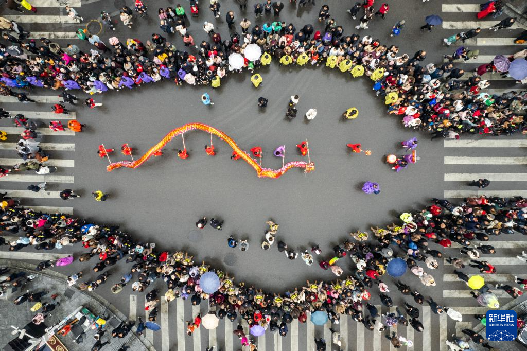 2月12日,市民和游客在张家界市永定区观看巡游演出(无人机照片)。