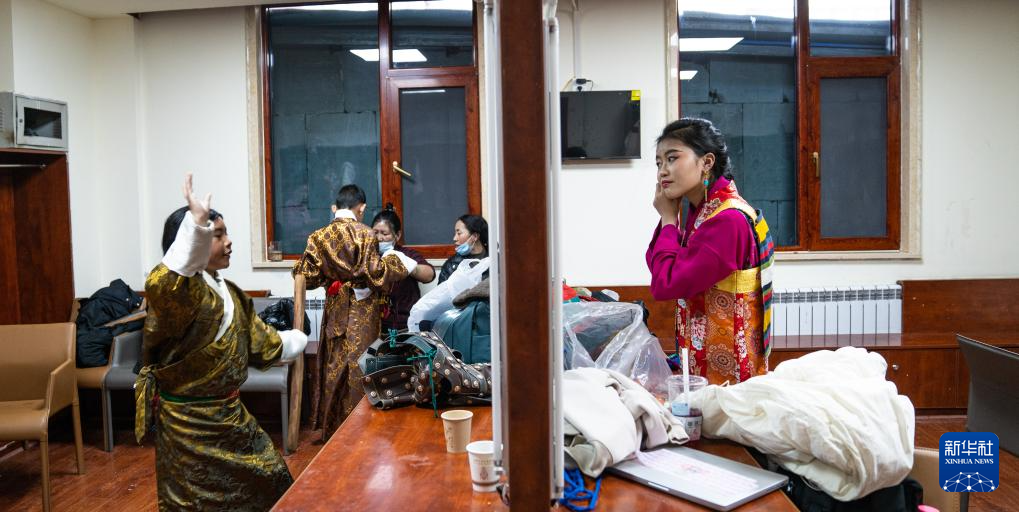 小演员在准备演出舞台剧藏戏《顿月顿珠》(2月11日摄)。