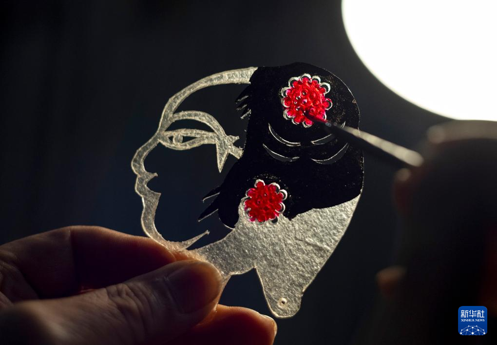 王彪的徒弟在给影人“张飞”的头部上色(2月19日摄)。