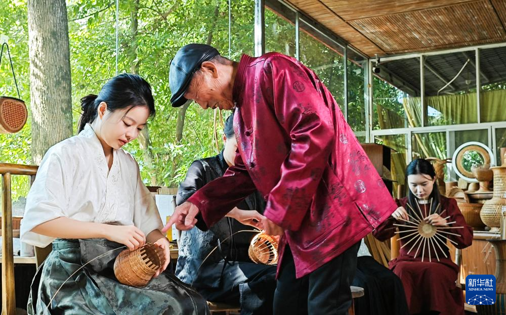 道明竹编国家级非遗代表性传承人赵思进(左二)在指导白梓忆(左一)编制竹罐(2024年10月27日摄)。
