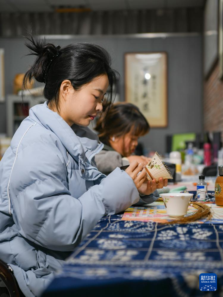 白梓忆(前)在编制“熊猫抱竹”盖碗茶杯(3月7日摄)。
