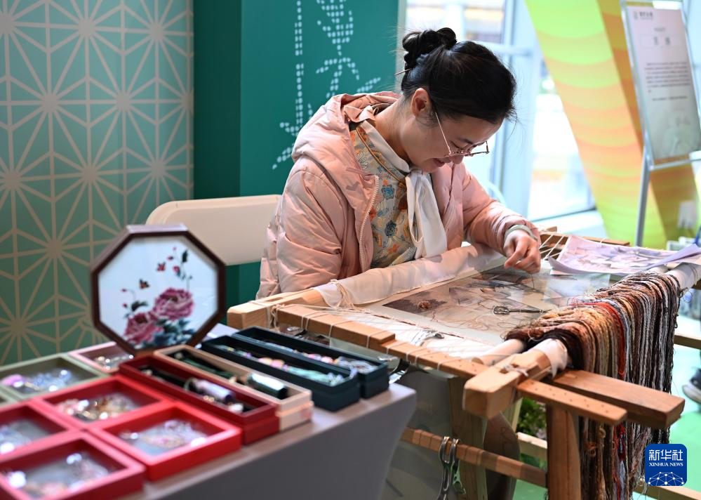 3月29日,嘉宾在嘉亭荟举行的文旅市集上展示非遗项目“苏绣”。