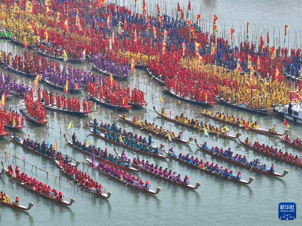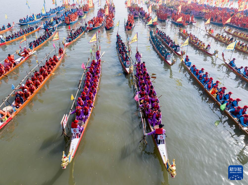 当日,2025泰州姜堰溱潼会船在江苏省泰州市姜堰区溱湖国家湿地公园开幕,五百多条各式船只和上万名会船选手飞篙走桨、弄潮击浪,演绎历久弥新的民俗画卷。
