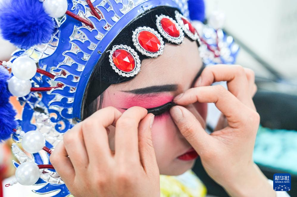 4月9日,在重庆市北碚区水土小学川剧排练室,工作人员在给一名孩子化妆。