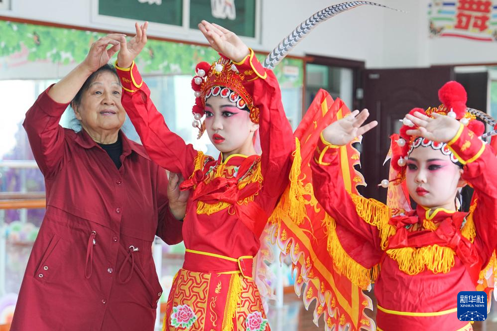 4月9日,在重庆市北碚区水土小学川剧排练室,川剧座唱区级非遗传承人刘永兰在指导孩子们动作要领。
