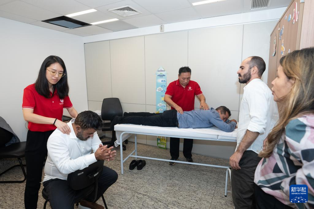 4月9日,在巴西戈亚斯州首府戈亚尼亚,中医孔子学院的老师为一名体验者进行推拿。