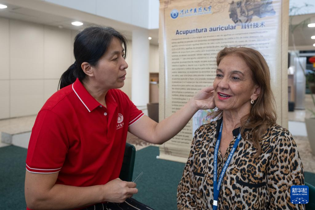 4月9日,在巴西戈亚斯州首府戈亚尼亚,中医孔子学院的老师为一名体验者实施耳穴疗法。