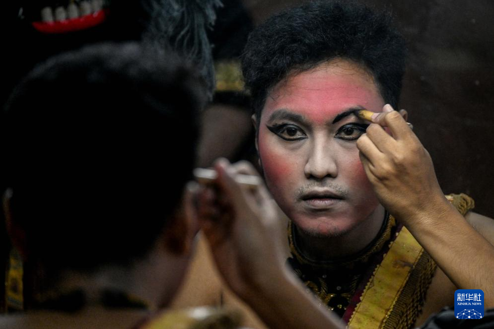 2024年12月20日,在印度尼西亚梭罗,哇扬人戏演员在表演前化妆。