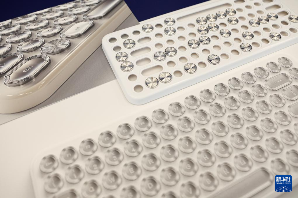 这是4月13日在意大利米兰设计周贵州工业设计城展区拍摄的由中意共同合作设计的银饰键盘。