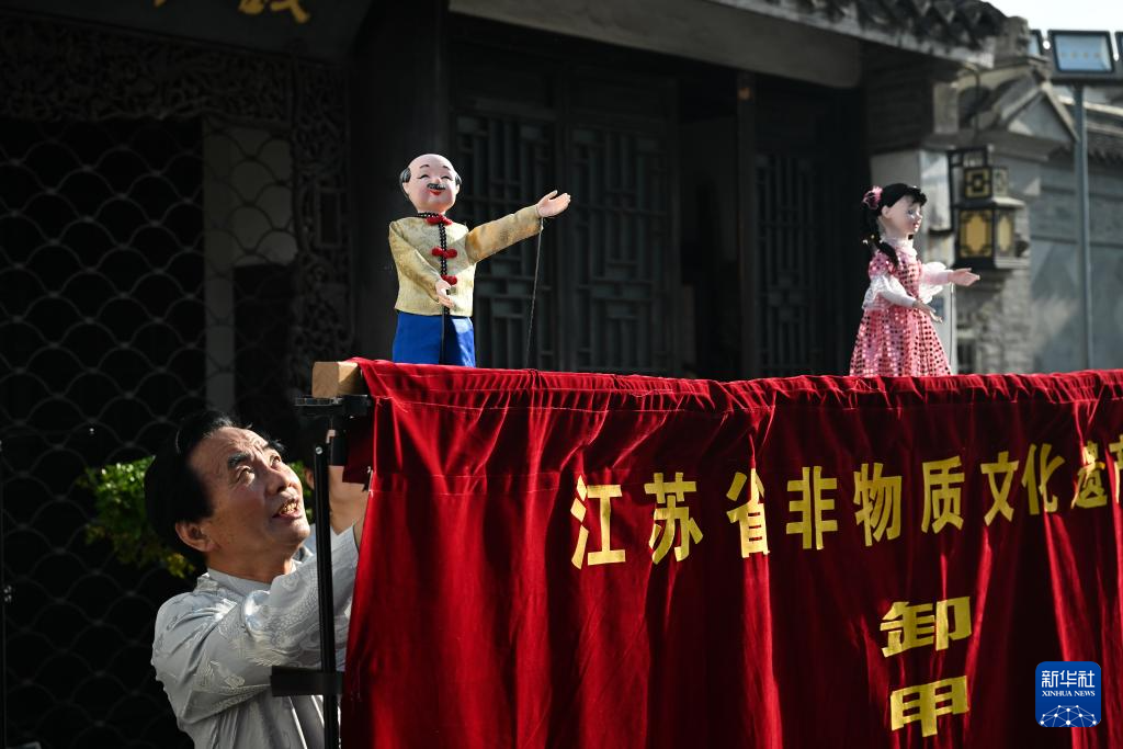 当日,在江苏省高邮市运河·盂城驿街区,木偶戏、挑花担、撂石锁等非遗项目表演吸引众多游人驻足观看。
