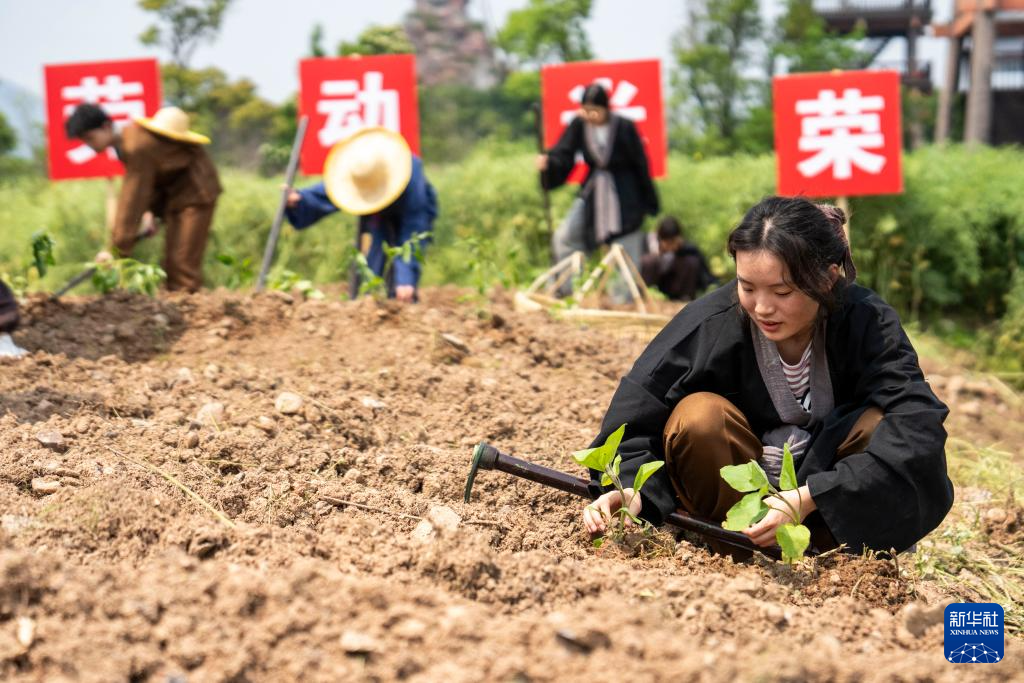 4月28日,在宁乡市炭河古城景区,学生在进行农耕实践。