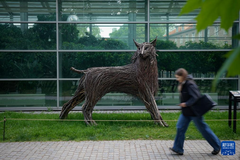 这是5月6日在波兰首都华沙拍摄的猞猁树枝雕塑。