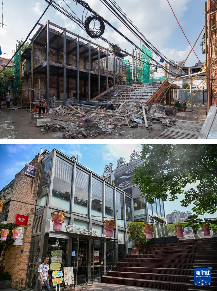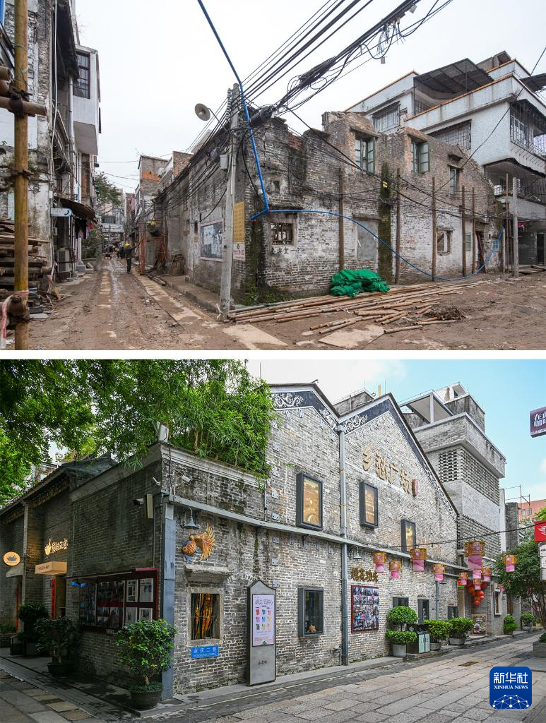 这是一张拼版照片:上图为改造前的永庆大街(资料照片,新华社发);下图为2025年5月13日拍摄的永庆坊永庆大街(新华社记者陈朔摄)。