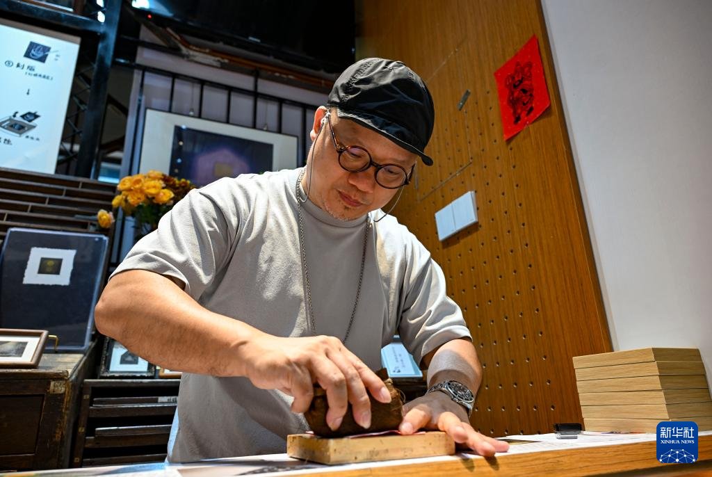 永庆坊一家活字印刷店店主赖朝阳在制作活字印刷装饰品(5月13日摄)。
